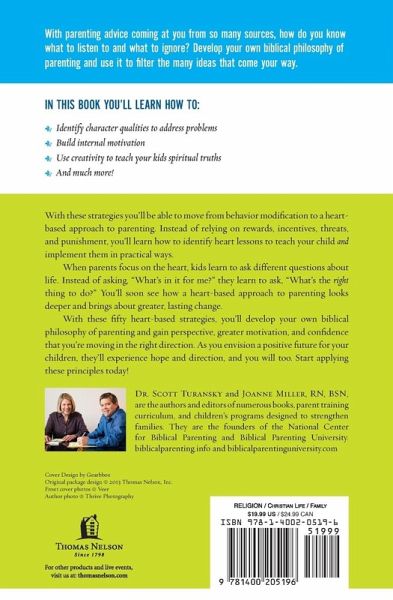 Bring about real and lasting change in your child's life and grow in your confidence as a parent. With advice on parenting coming from friends, social media, popular culture, and so many other places, what do you listen to and what do you ignore? In The Christian Parenting Handbook, you will learn to develop your own biblical philosophy of parenting and use it to filter the many ideas that come your way. The Christian Parenting Handbook by Dr. Scott Turansky and Joanne Miller, founders of the National Center for Biblical Parenting, compiles 50 parenting principles that use heart-based strategies to teach you how to face daily challenges. When parents focus on the heart, kids learn to ask different questions about life. Instead of asking, "What's in it for me?" they learn to ask, "What's the right thing to do?" You'll soon see how a heart-based approach to parenting looks deeper and brings about greater, lasting change. In The Christian Parenting Handbook, you'll learn how to: * Identify heart lessons to teach your child * Learn ways to correct, instruct, and set limits * Transfer responsibility for change to your child * Build internal motivation * Teach your kids to be solvers instead of whiners * Identify character qualities to address problems * Use creativity to teach your kids spiritual truths * Envision a positive future for your children * And much more! With these strategies, you'll be able to move from behavior modification to a heart-based approach to parenting. Instead of relying on rewards, incentives, threats, and punishment, you'll learn how to identify heart lessons to teach your child and implement them in practical ways. The daily interaction you have with your children can impact them for the rest of their lives. With these 50 heart-based strategies, you'll develop your own biblical philosophy of parenting and gain perspective, greater motivation, and confidence that you're moving in the right direction!