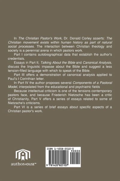 In The Christian Pastor's Work, Dr. Donald Corley asserts: The Christian movement exists within human history as part of natural social processes. The interaction between Christian theology and society is a perennial arena in which pastors work. Part I contains autobiographical data that establish the author's credentials. Essays in Part II, Talking About the Bible and Canonical Analysis, discuss the linguistic impasse about the Bible and suggest a less tension-filled language with which to speak of the Bible. Part III offers a demonstration of canonical analysis applied to Paul's I Corinthian letter. In Part IV the author proposes several Components of a Pastoral Model, interpolated from the educational and psychiatric fields Because intellectual criticism is one of the tensions contemporary pastors face, and because Friederich Nietzsche has been a critic of Christianity, Part V offers a series of essays related to some of Nietzsche's criticisms. Part VI is a series of brief essays about specific aspects of a Christian pastor's work.