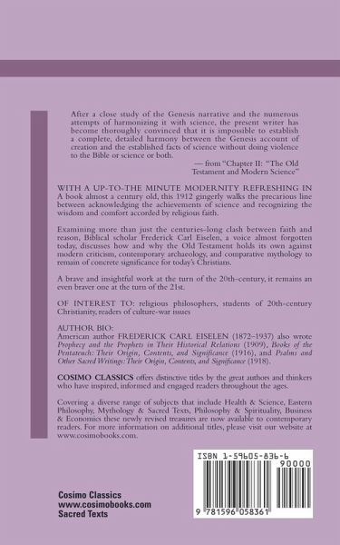 After a close study of the Genesis narrative and the numerous attempts of harmonizing it with science, the present writer has become thoroughly convinced that it is impossible to establish a complete, detailed harmony between the Genesis account of creation and the established facts of science without doing violence to the Bible or science or both. -from "Chapter II: The Old Testament and Modern Science" With a up-to-the minute modernity refreshing in a book almost a century old, this 1912 gingerly walks the precarious line between acknowledging the achievements of science and recognizing the wisdom and comfort accorded by religious faith. Examining more than just the centuries-long clash between faith and reason, Biblical scholar Frederick Carl Eiselen, a voice almost forgotten today, discusses how and why the Old Testament holds its own against modern criticism, contemporary archaeology, and comparative mythology to remain of concrete significance for today's Christians. A brave and insightful work at the turn of the 20th-century, it remains an even braver one at the turn of the 21st. OF INTEREST TO: religious philosophers, students of 20th-century Christianity, readers of culture-war issues American author FREDERICK CARL EISELEN (1872-1937) also wrote Prophecy and the Prophets in Their Historical Relations (1909), Books of the Pentateuch: Their Origin, Contents, and Significance (1916), and Psalms and Other Sacred Writings: Their Origin, Contents, and Significance (1918).