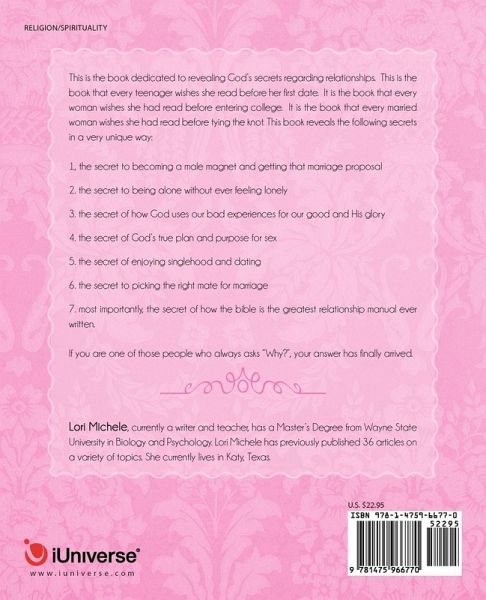 This is the book dedicated to revealing God's secrets regarding relationships. This is the book that every teenager wishes she read before her first date. It is the book that every woman wishes she had read before entering college. It is the book that every married woman wishes she had read before tying the knot. This book reveals the following secrets in a very unique way: 1, the secret to becoming a male magnet and getting that marriage proposal 2. the secret to being alone without ever feeling lonely 3. the secret of how God uses our bad experiences for our good and His glory 4. the secret of God's true plan and purpose for sex 5. the secret of enjoying singlehood and dating 6. the secret to picking the right mate for marriage 7. most importantly, the secret of how the bible is the greatest relationship manual ever written. If you are one of those people who always asks "Why?", your answer has finally arrived.