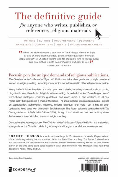 The standard style guide of the Christian publishing industry, The Christian Writer's Manual of Style, 4th Edition, compiled by veteran Zondervan editor Robert Hudson, contains clear guidance on style questions related to religious writing, including many topics not addressed in other references or online. Nearly half of this fourth revision is made up of new material, including information about turning blogs into books, the effects of digital media on writing, "adverbial doubles," "vanishing accents," word-choice strategies, endorser guidelines, and much more. It also contains an all-new "Word List" which makes up more than a third of the book. The most needful information remains--entries on capitalization, abbreviation, citations, fictional dialogue, and more--but it has all been updated to keep pace with changes in English language usage. This fourth edition also corresponds with The Chicago Manual of Style, 16th Edition (2010), though it isn't afraid to chart new territory where that reference is unhelpful on issues of religious writing. Comprehensive yet easy-to-use, The Christian Writer's Manual of Style, 4th Edition, is a go-to resource for Christian authors, pastors, teachers, copy writers, editors, proofreaders, publishing and ministry professionals, executive assistants, and students--anyone who writes or edits as a part of their work or study--and for grammar aficionados everywhere.