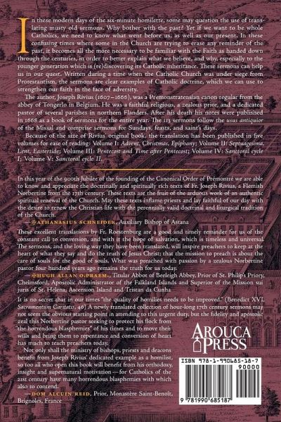 In these modern days of the six-minute homilette, some may question the use of translating musty old sermons. Why bother with the past? Yet if we want to be whole Catholics, we need to know what went before us, as well as our present. In these confusing times where some in the Church are trying to erase any reminder of the past, it becomes all the more necessary to be familiar with the Faith as handed down through the centuries, in order to better explain what we believe, and why, especially to the younger generation which is (re)discovering its Catholic inheritance. These sermons can help us in our quest. Written during a time when the Catholic Church was under siege from Protestantism, the sermons are clear examples of Catholic doctrine, which we can use to strengthen our faith in the face of adversity. The author, Joseph Rivius (1607-1666), was a Premonstratensian canon regular from the abbey of Tongerlo in Belgium. He was a faithful religious, a zealous prior, and a dedicated pastor of several parishes in northern Flanders. After his death his notes were published in 1668 as a book of sermons for the entire year. The 113 sermons follow the usus antiquior of the Missal and comprise sermons for Sundays, feasts, and saint's days.Because of the size of Rivius' original book, the translation has been published in five volumes for ease of reading: Volume I: Advent, Christmas, Epiphany; Volume II: Septuagesima, Lent, Eastertide; Volume III: Pentecost and Time after Pentecost; Volume IV: Sanctoral cycle I; Volume V: Sanctoral cycle II.