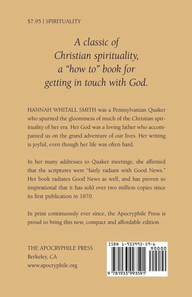 Hannah Whitall Smith was a Pennsylvanian Quaker who spurned the gloominess of much of the Christian spirituality of her era. Her God was a loving father who accompanied us on the grand adventure of our lives. Her writing is joyful, even though her life was often hard. In her many addresses to Quaker meetings, she affirmed that the scriptures were "fairly radiant with Good News." Her book radiates Good News as well, and has proven so inspirational that it has sold over two million copies since its first publication in 1870. In print continuously ever since, the Apocryphile Press is proud to bring this new, compact and affordable edition.
