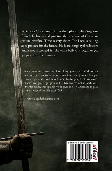 It is time for Christians to know their place in the Kingdom of God. To know and practice the weapons of Christian spiritual warfare. Time is very short. The Lord is calling us to prepare for the future. He is training loyal followers and is not interested in lukewarm believers. Begin to get prepared for the journey. Frank Scavone turned to God forty years ago. With much determination to know more about God, the journey has put Frank right in the middle of God's plan for people of this world. There is no greater purpose in life than to accomplish God's will. Frank's desire, through his writings, is to help Christians to gain knowledge of the things of God. Knowledgeshallincrease.com