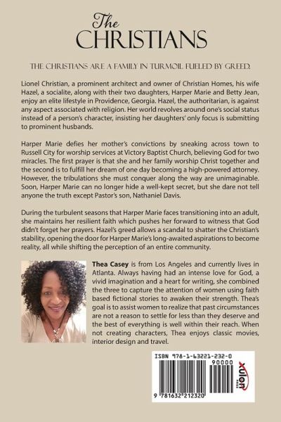 The Christians are a family in turmoil fueled by greed. Lionel Christian, a prominent architect and owner of Christian Homes, his wife Hazel, a socialite, along with their two daughters, Harper Marie and Betty Jean, enjoy an elite lifestyle in Providence, Georgia. Hazel, the authoritarian, is against any aspect associated with religion. Her world revolves around one's social status instead of a person's character, insisting her daughters' only focus is submitting to prominent husbands. Harper Marie defies her mother's convictions by sneaking across town to Russell City for worship services at Victory Baptist Church, believing God for two miracles. The first prayer is that she and her family worship Christ together and the second is to fulfill her dream of one day becoming a high-powered attorney. However, the tribulations she must conquer along the way are unimaginable. Soon, Harper Marie can no longer hide a well-kept secret, but she dare not tell anyone the truth except Pastor's son, Nathaniel Davis. During the turbulent seasons that Harper Marie faces transitioning into an adult, she maintains her resilient faith which pushes her forward to witness that God didn't forget her prayers. Hazel's greed allows a scandal to shatter the Christian's stability, opening the door for Harper Marie's long-awaited aspirations to become reality, all while shifting the perception of an entire community. Thea Casey is from Los Angeles and currently lives in Atlanta. Always having had an intense love for God, a vivid imagination and a heart for writing, she combined the three to capture the attention of women using faith based fictional stories to awaken their strength. Thea's goal is to assist women to realize that past circumstances are not a reason to settle for less than they deserve and the best of everything is well within their reach. When not creating characters, Thea enjoys classic movies, interior design and travel.