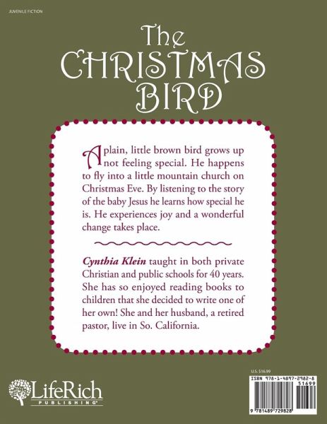 A plain, little brown bird grows up not feeling special. He happens to fly into a little mountain church on Christmas Eve. By listening to the story of the baby Jesus he learns how special he is. He experiences joy and a wonderful change takes place.