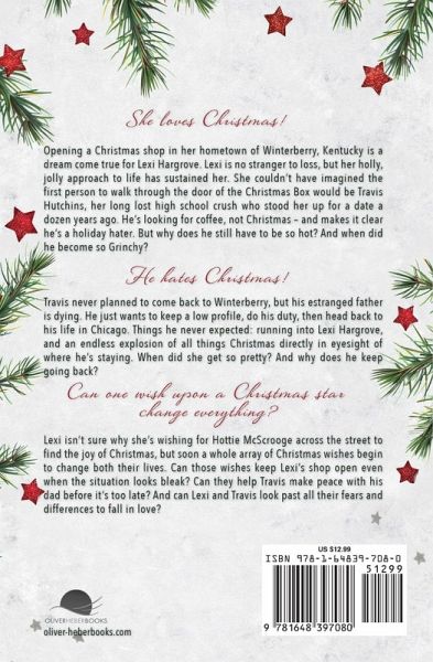 She loves Christmas! Opening a Christmas shop in her hometown of Winterberry, Kentucky is a dream come true for Lexi Hargrove. Lexi is no stranger to loss, but her holly, jolly approach to life has sustained her. She couldn't have imagined the first person to walk through the door of the Christmas Box would be Travis Hutchins, her long lost high school crush who stood her up for a date a dozen years ago. He's looking for coffee, not Christmas - and makes it clear he's a holiday hater. But why does he still have to be so hot? And when did he become so Grinchy? He hates Christmas! Travis never planned to come back to Winterberry, but his estranged father is dying. He just wants to keep a low profile, do his duty, then head back to his life in Chicago. Things he never expected: running into Lexi Hargrove, and an endless explosion of all things Christmas directly in eyesight of where he's staying. When did she get so pretty? And why does he keep going back? Can one wish upon a Christmas star change everything? Lexi isn't sure why she's wishing for Hottie McScrooge across the street to find the joy of Christmas, but soon a whole array of Christmas wishes begin to change both their lives. Can those wishes keep Lexi's shop open even when the situation looks bleak? Can they help Travis make peace with his dad before it's too late? And can Lexi and Travis look past all their fears and differences to fall in love?