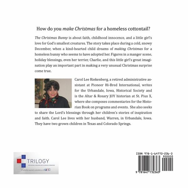 How do you make Christmas for a homeless cottontail? The Christmas Bunny is about faith, childhood innocence, and a little girl's love for God's smallest creatures. The story takes place during a cold, snowy December, when a kind-hearted child dreams of making Christmas for a homeless bunny who seems to have adopted her. Figures in a manger scene, holiday blessings, even her terrier, Charlie, and this little girl's great imagination play an important part in making a very unusual Christmas surprise come true.