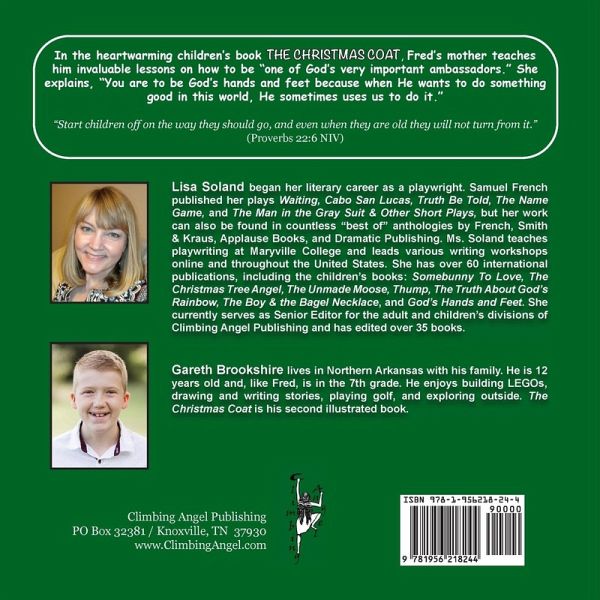 In the heartwarming children's book THE CHRISTMAS COAT, Fred's mother teaches him invaluable lessons on how to be "one of God's very important ambassadors." She explains, "You are to be God's hands and feet because when He wants to do something good in this world, He sometimes uses us to do it." "Start children off on the way they should go, and even when they are old they will not turn from it."(Proverbs 22:6 NIV)