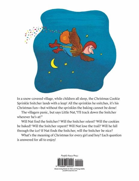 In a snow covered village, while children all sleep, the Christmas Cookie Sprinkle Snitcher, lands with a leap! All the sprinkles he snitches, it's his Christmas fun, but without sprinkles the baking cannot be done! The villagers panic, but says Little Nat, "I'll track down the Snitcher wherever he's at!" Will Nat find the Snitcher? Will the Snitcher relent? Will the cookies be baked? Will the Snitcher repent? Will Nat lose the trail? Will he fall through the ice? If Nat finds the Snitcher, will the Snitcher be nice? These questions are answered for all to enjoy!