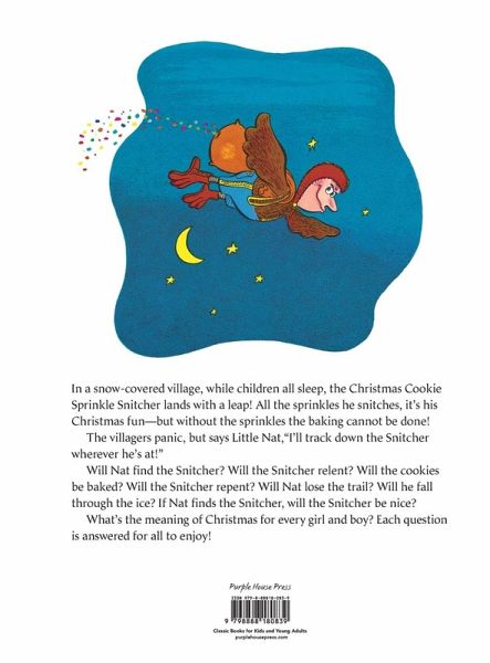 In a snow covered village, while children all sleep, the Christmas Cookie Sprinkle Snitcher, lands with a leap! All the sprinkles he snitches, it's his Christmas fun, but without sprinkles the baking cannot be done! The villagers panic, but says Little Nat, "I'll track down the Snitcher wherever he's at!" Will Nat find the Snitcher? Will the Snitcher relent? Will the cookies be baked? Will the Snitcher repent? Will Nat lose the trail? Will he fall through the ice? If Nat finds the Snitcher, will the Snitcher be nice? These questions are answered for all to enjoy!