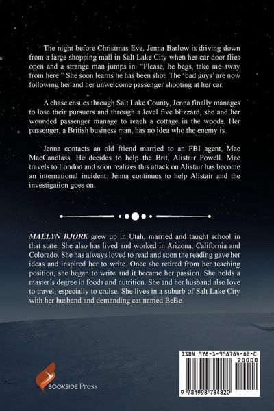 The night before Christmas Eve, Jenna Barlow is driving down from a large shopping mall in Salt Lake City when her car door flies open and a strange man jumps in. "Please, he begs, take me away from here." She soon learns he has been shot. The 'bad guys' are now following her and her unwelcome passenger shooting at her car. A chase ensues through Salt Lake County, Jenna finally manages to lose their pursuers and through a level five blizzard, she and her wounded passenger manage to reach a cottage in the woods. Her passenger, a British business man, has no idea who the enemy is. Jenna contacts an old friend married to an FBI agent, Mac MacCandlass. He decides to help the Brit, Alistair Powell. Mac travels to London and soon realizes this attack on Alistair has become and international incident. Jenna continues to help Alistair and the investigation goes on.