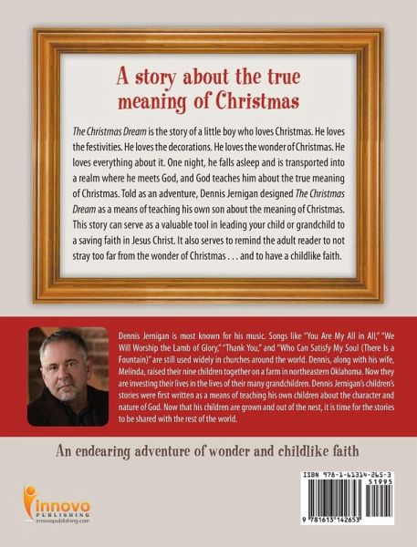 ABOUT THE BOOK: The Christmas Dream is the story of a little boy who loves Christmas. He loves the festivities. He loves the decorations. He loves the wonder of Christmas. He loves everything about it. One night, he falls asleep and is transported into a realm where he meets God, and God teaches him about the true meaning of Christmas. Told as an adventure, Dennis Jernigan designed The Christmas Dream as a means of teaching his own son about the meaning of Christmas. This story can serve as a valuable tool in leading your child or grandchild to a saving faith in Jesus Christ. It also serves to remind the adult reader to not stray too far from the wonder of Christmas . . . and to have a childlike faith. **** ABOUT THE AUTHOR: Dennis Jernigan is most known for his music. Songs like "You Are My All in All," "We Will Worship the Lamb of Glory," "Thank You," and "Who Can Satisfy My Soul (There Is a Fountain)" are still used widely in churches around the world. Dennis, along with his wife, Melinda, raised their nine children together on a farm in northeastern Oklahoma. Now they are investing their lives in the lives of their many grandchildren. Dennis Jernigan's children's stories were first written as a means of teaching his own children about the character and nature of God. Now that his children are grown and out of the nest, it is time for the stories to be shared with the rest of the world.
