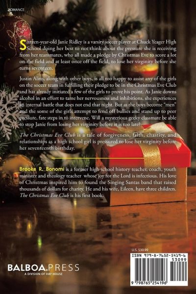 Sixteen-year-old Janie Ridley is a varsity soccer player at Chuck Yeager High School doing her best to not think about the pressure she is receiving from her teammates, who all made a pledge by Christmas Eve to score a lot on the field and at least once off the field, to lose her virginity before she turns seventeen. Justin Alito, along with other boys, is all too happy to assist any of the girls on the soccer team in fulfilling their pledge to be in the Christmas Eve Club and has already initiated a few of the girls to prove his point. As Janie downs alcohol in an effort to tame her nervousness and inhibitions, she experiences an internal battle that does not end that night. But as the boys become "men" and the some of the girls attempt to fend off bullies and stand up to peer pressure, fate steps in to intervene. Will a mysterious geeky classmate be able to stop Janie from losing her virginity before it is too late? The Christmas Eve Club is a tale of forgiveness, faith, chastity, and relationships as a high school girl is pressured to lose her virginity before her seventeenth birthday.
