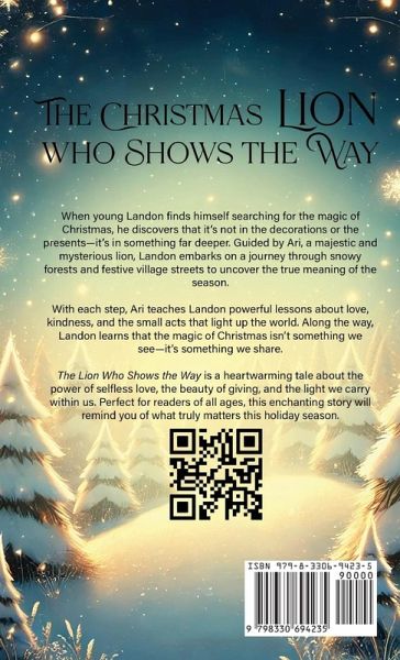 When Landon finds himself feeling lost and uncertain during the holiday season, an unexpected encounter changes everything. Deep in the snowy woods, he meets Ari, the wise and magical Christmas Lion, whose golden mane shines like the Christmas star. Ari isn't just any lion-he's a guide sent to show Landon the true path to courage, kindness, and the joy of giving. Together, Landon and Ari embark on a journey filled with wonder, heartwarming lessons, and a few surprises along the way. With Ari's gentle wisdom and a touch of Christmas magic, Landon discovers how to navigate challenges, find his purpose, and celebrate the spirit of the season. Landon and the Christmas Lion is a timeless holiday tale that weaves together themes of faith, hope, and the importance of following your heart. Perfect for children and families, this enchanting story is sure to become a cherished part of your Christmas traditions. Features: ¿ Ideal for readers aged 6-10, or for families to enjoy together. ¿ A heartwarming story about self-discovery, guided by faith and wisdom. ¿ Beautifully written to inspire conversations about courage, kindness, and the magic of the holiday season. This Christmas, take a journey with Landon and Ari, the Christmas Lion, and discover the light that guides us all. A perfect gift for the holiday season!