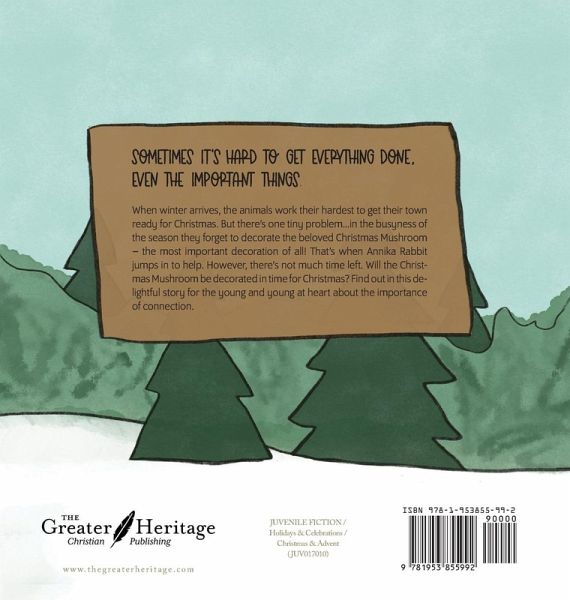 Sometimes it's hard to get everything done, even the important things. When winter arrives, the animals work their hardest to get their town ready for Christmas. But there's one tiny problem...in the busyness of the season they forget to decorate the beloved Christmas Mushroom - the most important decoration of all! That's when Annika Rabbit jumps in to help. However, there's not much time left. Will the Christmas Mushroom be decorated in time for Christmas? Find out in this delightful story for the young and young at heart about the importance of connection.