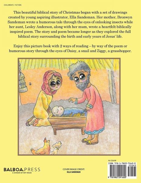 This beautiful biblical story of Christmas began with a set of drawings created by young aspiring illustrator, Ella Sandeman. Her mother wrote a humorous tale through the eyes of onlooking insects while her aunt, Lesley Anderson, wrote a heartfelt biblically inspired poem. The story became longer as they explored the full biblical story surrounding the birth and early years of Jesus' life. Enjoy this picture book with 2 ways of reading - by way of the poem or humorous story through the eyes of Ziggy , a grasshopper and Daisy, a snail.