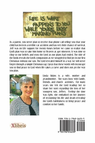 As a parent, you never plan to receive that phone call telling you that your child has been in a terrible car accident and has very little chance of survival. Jeff was on Life support for twenty-hours before we came to realize that God's plan was to take him home to Heaven at age nineteen. It was time to cling to our beliefs and trust the Lord as our plans had ended. The title of the book reveals the Lord's compassion as we struggled to find joy in our first Christmas without our son. The Lord revealed himself in a way we will never forget through a simple Christmas tag. I pray that these words will encourage you to find peace in God when life takes a curve and does not go the way you plan.