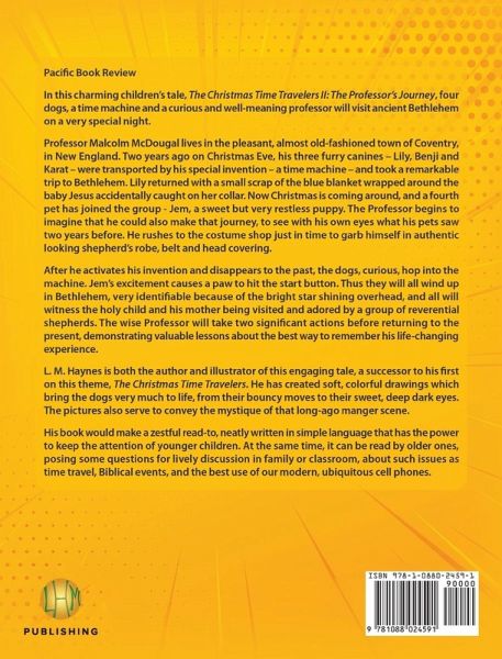 In this charming children's tale, The Christmas Time Travelers II: The Professor's Journey, four dogs, a time machine and a curious and well-meaning professor will visit ancient Bethlehem on a very special night. Professor Malcolm McDougal lives in the pleasant, almost old-fashioned town of Coventry, in New England. Two years ago on Christmas Eve, his three furry canines - Lily, Benji and Karat - were transported by his special invention - a time machine - and took a remarkable trip to Bethlehem. Lily returned with a small scrap of the blue blanket wrapped around the baby Jesus accidentally caught on her collar. Now Christmas is coming around, and a fourth pet has joined the group - Jem, a sweet but very restless puppy. The Professor begins to imagine that he could also make that journey, to see with his own eyes what his pets saw two years before. He rushes to the costume shop just in time to garb himself in authentic looking shepherd's robe, belt and head covering. After he activates his invention and disappears to the past, the dogs, curious, hop into the machine. Jem's excitement causes a paw to hit the start button. Thus they will all wind up in Bethlehem, very identi able because of the bright star shining overhead, and all will witness the holy child and his mother being visited and adored by a group of reverential shepherds. The wise Professor will take two signi cant actions before returning to the present, demonstrating valuable lessons about the best way to remember his life-changing experience.