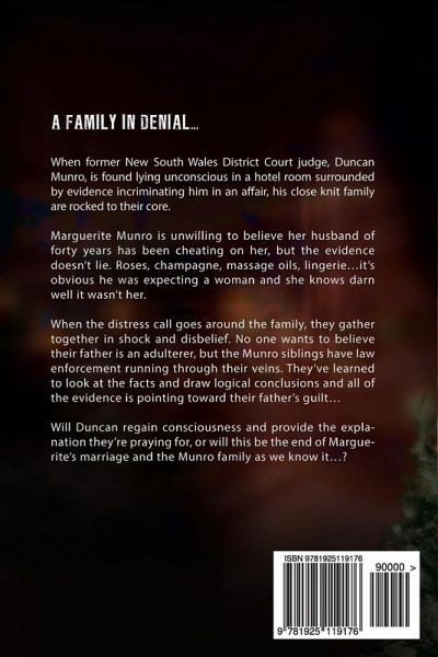A family in denial... When former New South Wales District Court judge, Duncan Munro, is found lying unconscious in a hotel room surrounded by evidence incriminating him in an affair, his close knit family are rocked to their core. Marguerite Munro is unwilling to believe her husband of forty years has been cheating on her, but the evidence doesn't lie. Roses, champagne, massage oils, lingerie...it's obvious he was expecting a woman and she knows darn well it wasn't her. When the distress call goes around the family, they gather together in shock and disbelief. No one wants to believe their father is an adulterer, but the Munro siblings have law enforcement running through their veins. They've learned to look at the facts and draw logical conclusions and all of the evidence is pointing toward their father's guilt... Will Duncan regain consciousness and provide the explanation they're praying for, or will this be the end of Marguerite's marriage and the Munro family as we know it...?