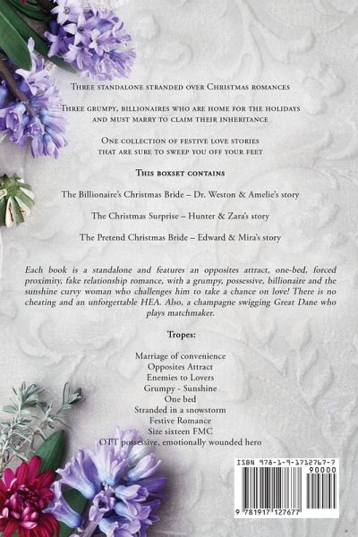 Three standalone stranded over Christmas romances Three grumpy, billionaires who are home for the holidays and must marry to claim their inheritance One collection of festive love stories that are sure to sweep you off your feet This boxset contains The Billionaire's Christmas Bride - Dr. Weston & Amelie's story The Christmas Surprise - Hunter & Zara's story The Pretend Christmas Bride - Edward & Mira's story Each book is a standalone and features an opposites attract, one-bed, forced proximity, fake relationship romance, with a grumpy, possessive, billionaire and the sunshine curvy woman who challenges him to take a chance on love! There is no cheating and an unforgettable HEA. Also, a champagne swigging Great Dane who plays matchmaker. 1-Click NOW Tropes: Marriage of convenience Opposites Attract Enemies to Lovers Grumpy - Sunshine One bed Stranded in a snowstorm Festive Romance Size sixteen FMC OTT possessive, emotionally wounded hero
