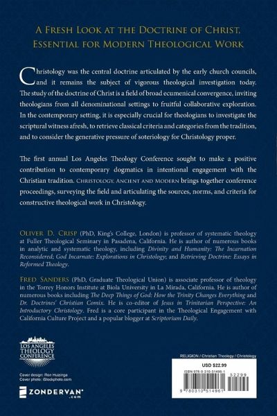 A Fresh Look at the Doctrine of Christ. Christology was the central doctrine articulated by the early church councils, and it remains the subject of close theological investigation today. Christology, Ancient and Modern--the first volume in a series of published proceedings from the annual Los Angeles Theology Conference--brings together conference proceedings, surveying the field and articulating the sources, norms, and criteria for constructive theological work in Christology. The ten diverse essays in this collection include discussions on: The types of historical Christologies and evaluations of various approaches to the theology of Christ. A close look at the trajectory and divergence of modern denominational understandings of Christ's work and person. Discussions of implications and challenges to specific Christologies regarding detailed exegetical considerations. Each of the essays collected in this volume engage with Scripture as well as with others in the field--theologians both past and present, from different confessions--in order to provide constructive resources for contemporary systematic theology and to forge a theology for the future.