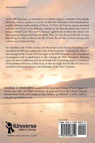 In the Old Testament, an anointed one would be a king or a member of the temple hierarchy, such as a priest or a Levite. In the New Testament, Paul introduced an entirely different understanding of Christ. A Christ of God was anyone anointed with the life of God as His offspring, whether or not that the person was aware of being a child of God. The word "Christian" applied only to those who chose to be born again by being raised from the dead. Thus, we must let go of the life we have been living in order to take on the life of God. We are then a Christ of God, just as Jesus was a Christ of God. In a detailed study of this concept, the Reverend Canon George Cummings contextualizes his lifelong reading and study of the Scriptures, following the thread of the message of the Gospel from its origin in the Old Testament to its triumphant re-emergence and re-signification in the writings the New Testament. Drawing upon his years of reflection and use of Greek text, Cummings posits a conception of the presence of God as Christ in us, so that we might live the life of God as it is revealed in the person of Jesus, the Messenger of the New Covenant.