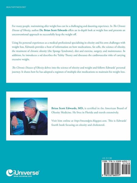 For many people, maintaining after weight loss can be a challenging and daunting experience. In The Chronic Disease of Obesity, author Dr. Brian Scott Edwards offers an in-depth look at weight loss and presents an unconventional approach to successfully keep the weight off. Using his personal experiences as a medical professional specializing in obesity and his own challenges with weight loss, Edwards provides a host of information on how medications, fat cells, the science of obesity, the treatment of chronic obesity (the Sponge Syndrome), diet and exercise, surgery, and maintenance. In addition, he introduces a nd describes the Tubby Theory and discusses the cardiovascular risks of carrying excessive weight. The Chronic Disease of Obesity delves into the science of obesity and weight and follows Edwards' personal journey. It shares how he has adopted a regimen of multiple diet medications to maintain his weight loss.