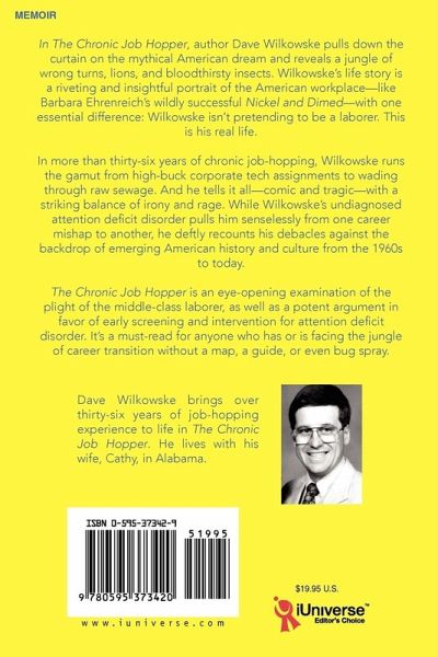 In The Chronic Job Hopper, author Dave Wilkowske pulls down the curtain on the mythical American dream and reveals a jungle of wrong turns, lions, and bloodthirsty insects. Wilkowske's life story is a riveting and insightful portrait of the American workplace-like Barbara Ehrenreich's wildly successful Nickel and Dimed-with one essential difference: Wilkowske isn't pretending to be a laborer. This is his real life. In more than thirty-six years of chronic job-hopping, Wilkowske runs the gamut from high-buck corporate tech assignments to wading through raw sewage. And he tells it all-comic and tragic-with a striking balance of irony and rage. While Wilkowske's undiagnosed attention deficit disorder pulls him senselessly from one career mishap to another, he deftly recounts his debacles against the backdrop of emerging American history and culture from the 1960s to today. The Chronic Job Hopper is an eye-opening examination of the plight of the middle-class laborer, as well as a potent argument in favor of early screening and intervention for attention deficit disorder. It's a must-read for anyone who has or is facing the jungle of career transition without a map, a guide, or even bug spray.