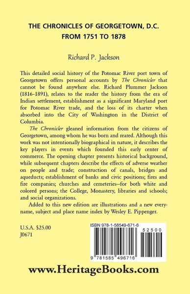 This detailed social history of the Potomac River port town of Georgetown offers personal accounts by The Chronicler that cannot be found anywhere else. Richard Plummer Jackson (1816-1891), relates to the reader the history from the era of Indian settlement, establishment as a significant Maryland port for Potomac River trade, and the loss of its charter when absorbed into the City of Washington in the District of Columbia. The Chronicler gleaned information from the citizens of Georgetown, among whom he was born and reared. Although this work was not intentionally biographical in nature, it describes the key players in events which founded this early center of commerce. The opening chapter presents historical background, while subsequent chapters describe the effects of adverse weather on people and trade; construction of canals, bridges and aqueducts; establishment of banks and civic positions; fires and fire companies; churches and cemeteries-for both white and colored persons; the College, Monastery, libraries and schools; and social organizations. Added to this new edition are illustrations and a new every-name, subject and place name index by Wesley E. Pippenger.