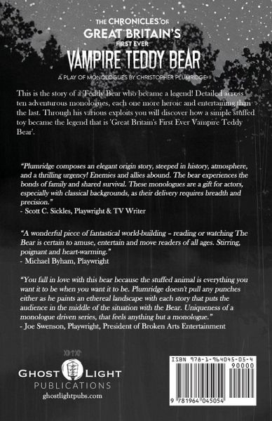 A play of monologues by Christopher Plumridge. This is the story of a Teddy Bear who became a legend! Detailed across ten adventurous monologues, each one more heroic and entertaining than the last. Through his various exploits you will discover how a simple stuffed toy became the legend that is 'Great Britain's First Ever Vampire Teddy Bear'.