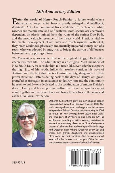 Enter the world of Henry Roach-Dairier: a future world where humans no longer exist. Insects, greatly enlarged and intelligent, dominate. Ants live communal lives, dedicated to each other, while roaches are materialistic and self-centered. But both species are chemically dependent on plastic, mined from the ruins of the extinct Duo Pods, and the most valuable resource of the insect world. Henry, son of a roach adopted by ants, tries to bridge the canyon of differences between these vying ideologies and cultures. The Re-Creation of Roacheria, the third book of the trilogy, tells Henry's own story. The adult Henry is an enigma. Most members of New South Dairy Colony 50 consider him too roach-like, even after he grows beyond the high jinx of his youth. Influencial roaches consider his ways of Antism, and the fact that he is of mixed variety, dangerous to their power structure. Hatreds dating back to the days of Henry's great-grandfather rise again in an attempt to destroy him and the community that is dedicated to the ways of his grandfather Antony, and which Henry seeks to build in Roacheria. Henry and his supporters realize that if the two species cannot come together in true peace, they will bring themselves to the same end as the Duo Pods--extinction.