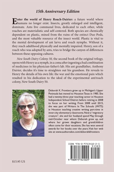 Enter the world of Henry Roach-Dairier: a future world where humans no longer exist. Insects, greatly enlarged and intelligent, dominate. Ants live comunal lives, dedicated to each other, while roaches are materialistic and self-centered. But both species are chemically dependent on plastic, mined from the ruins of the extinct Duo Pods, and the most valuable resource of the insect world. Henry, son of a roach adopted by ants, tries to bridge the canyon of differences between these vying ideologies and cultures. New South Dairy Colony 50, the second book of the trilogy, opens with Henry as a nymph, in a coma after accidentally ingesting a bad combination of medicines in his physician father's lab. His ant grandfather, Antony Dairier, decides it's time to straighten out his grandson. He reveals to Henry the details of his own life: the war and the emotional pain which resulted in his dedication to the ideal of the experimental ant/roach colony, New South Dairy 50.