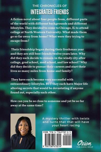The Chronicles of Integrated Friends A fiction novel about four people from, different parts of the world with different backgrounds and different lifestyles. They decided to come to Chicago, IL to attend college at North Western University. What made them go so far away from home? What were they trying to escape from? Their friendship began during their freshman year and they are still best friends twelve years later. Why did they each decide to remain in the windy city after college, grad school, med school, and law school? Why did they decide to pursue their careers and start their lives so many miles from home and family? They have each become very successful with extraordinary lifestyles. BUT they each have Major life altering secrets that would be devastating if anyone found out, especially each other. How can you be so close to someone and yet be so far away at the same time?