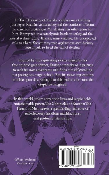 In The Chronicles of Krarshe, embark on a thrilling journey as Krarshe ventures beyond the comforts of home in search of excitement. Yet, destiny has other plans for him. Entrapped in a cataclysmic battle to safeguard the mortal realm's future, Krarshe must embrace his unexpected role as a hero. Sometimes, even against our own desires, fate impels to heed the call of destiny. Inspired by the captivating stories shared by his free-spirited grandfather, Krarshe embarks on a journey to seek his own adventures, and finds himself enrolling in a prestigious magic school. But, his naïve expectations crumble upon discovering that this realm is far from the utopia he imagined. In this world, where corruption lives and magic holds unfathomable power, The Chronicles of Krarshe: The Hearts of Men weaves a spellbinding narrative of self-discovery, insidious machinations, and profound friendships.