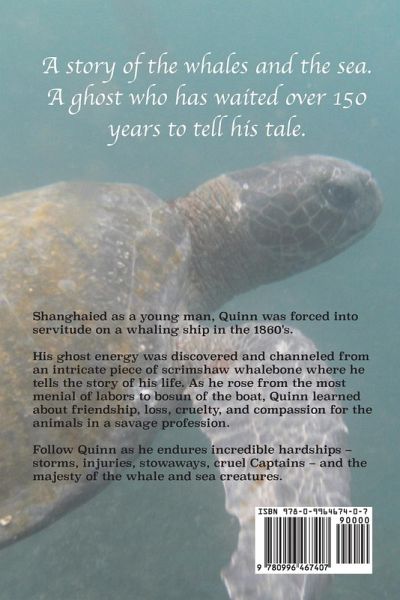 Shanghaied as young man, Quinn was forced into servitude on a whaling ship in the 1800's. His ghost energy was discovered and channeled from an intricate piece of scrimshaw whalebone where his tells the story of his life. As he rose from the most menial of labors to bosun of the boat, Quinn learned about friendship, loss, cruelty, and compassion for the animals in a savage profession. Follow Quinn as he endures incredible hardships- storms, injuries, stowaways, cruel captains - and the majesty of the whale and other sea creatures.