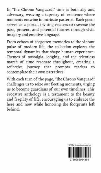 In "The Chrono Vanguard," time is both ally and adversary, weaving a tapestry of existence where moments entwine in intricate patterns. Each poem serves as a portal, inviting readers to traverse the past, present, and potential futures through vivid imagery and emotive language. From echoes of forgotten memories to the vibrant pulse of modern life, the collection explores the temporal dynamics that shape human experience. Themes of nostalgia, longing, and the relentless march of time resonate throughout, creating a reflective journey that prompts readers to contemplate their own narratives. With each turn of the page, "The Chrono Vanguard" challenges us to seize our fleeting moments, urging us to become guardians of our own timelines. This evocative anthology is a testament to the beauty and fragility of life, encouraging us to embrace the here and now while honoring the footprints left behind.
