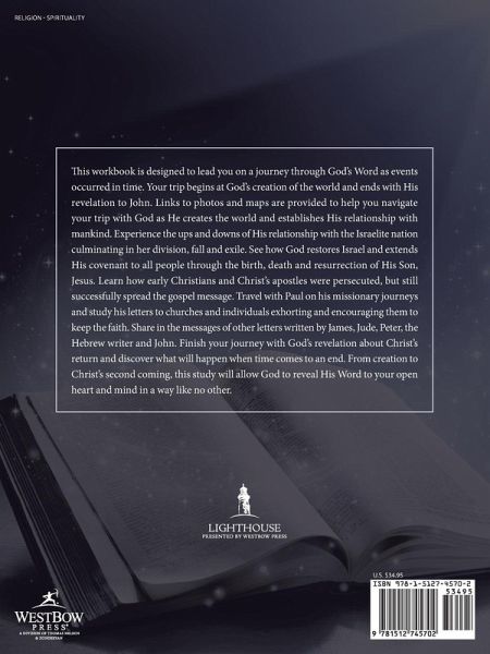 This comprehensive Bible study is designed to lead you on a journey through God's Word as events occurred in time. Your trip begins at God's creation of the world and ends with His revelation to John and Christ's second coming. This study will allow God to reveal His Word to your open heart and mind in a way like no other.