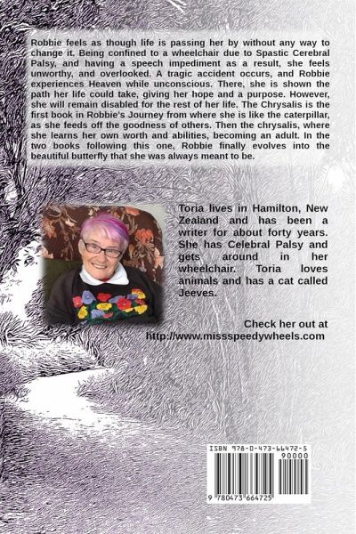 Robbie feels as though life is passing her by without any way to change it. Being confined to a wheelchair due to Spastic Cerebral Palsy, and having a speech impediment as a result, she feels unworthy, and overlooked. A tragic accident occurs, and Robbie experiences Heaven while unconscious. There, she is shown the path her life could take, giving her hope and a purpose. However, she will remain disabled for the rest of her life. The Chrysalis is the first book in Robbie's Journey from where she is like the caterpillar, as she feeds off the goodness of others. Then the chrysalis, where she learns her own worth and abilities, becoming an adult. In the two books following this one, Robbie finally evolves into the beautiful butterfly that she was always meant to be.