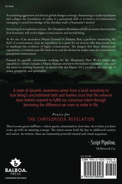 As escalating aggression and chaotic global changes converge, threatening to crush our dreams and collapse the foundation of reality is a perceptual shift or evolution of consciousness emerging to unveil knowledge of the absolute truth of humanity’s destiny. Stemming from authentic science, The Chrysopoeia Revelation unfolds an answer that includes how humanity will evolve higher consciousness and mortal being. At the site of an anomalous Mayan Pyramid in Panama, Ben, a professor researching the field of consciousness, joins an expedition in quest for an ancient relic that reveals how to accelerate the evolution of higher consciousness. The dangers Ben faces, dimensional experiences, a romantic past-life back-story, and the choices he makes raises his super-conscious abilities. Pursued by guerilla mercenaries working for the Illuminati’s New World Order, the expedition—which includes a Mayan Shaman and yet-to-be-realized soul mates—discovers the secret to evolving humanity in accord with the Mayan 2012 prophesy of a new age of peace, prosperity, and spirituality. Praise for The Chrysopoeia Revelation: There is some great stuff here—vision quests, reincarnation, slow time. As a writer, you have come up with an amazing concept. The vision scenes hold the key to additional tension and action. As written, these are immensely powerful mental and visual sequences. –Script Pipeline, Hollywood, Ca.