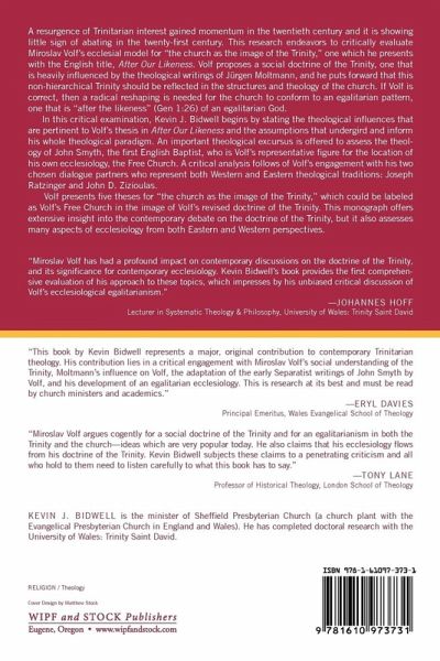 A resurgence of Trinitarian interest gained momentum in the twentieth century and it is showing little sign of abating in the twenty-first century. This research endeavors to critically evaluate Miroslav Volf's ecclesial model for ""the church as the image of the Trinity,"" one that he presents with the English title, After Our Likeness. Volf proposes a social doctrine of the Trinity, one that is heavily influenced by the theological writings of Jurgen Moltmann, and he puts forward that this nonhierarchical Trinity should be reflected in the structures and theology of the church. If Volf is correct, then a radical reshaping is needed for the church to conform to an egalitarian pattern, one that is ""after the likeness"" (Gen 1:26) of an egalitarian God. In this critical examination, Kevin J. Bidwell begins by stating the theological influences that are pertinent to Volf's thesis in After Our Likeness and the assumptions that undergird and inform his whole theological paradigm. An important theological excursus is offered to assess the theology of John Smyth, the first English Baptist, who is Volf's representative figure for the location of his own ecclesiology, the Free Church. A critical analysis follows of Volf's engagement with his two chosen dialogue partners who represent both Western and Eastern theological traditions: Joseph Ratzinger and John D. Zizioulas. Volf presents five theses for ""the church as the image of the Trinity,"" which could be labeled as Volf's Free Church in the image of Volf's revised doctrine of the Trinity. This monograph offers extensive insight into the contemporary debate on the doctrine of the Trinity, but it also assesses many aspects of ecclesiology from both Eastern and Western perspectives.