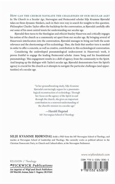 How can the church navigate the challenges of our secular age? In The Church in a Secular Age, Norwegian and Pentecostal scholar Silje Kvamme Bjorndal takes on three dynamic thinkers, each in their own way, in search for insights to this question. Philosopher Charles Taylor offers the backdrop for the conversation, as Bjorndal carefully sifts out some of his most central tenets for understanding our secular age. Bjorndal then turns to the theologian and ethicist Stanley Hauerwas and critically engages his notion of the church as a community set apart from our secular age. By bringing several of Hauerwas's interlocutors into the conversation, Bjorndal manages to bring out both the acute relevance and the shortcomings of his ecclesiology. Thus, she finds that another turn is needed in order to offer a concrete, as well as creative, contribution to this ecclesiological conversation. Considering the undeveloped pneumatological undercurrent in Hauerwas's work, it proves fruitful to engage the leading Pentecostal scholar Amos Yong and his foundational pneumatology. This engagement results in a shift of agency, from the community to the Spirit. And keeping up the dialogue with Taylor's secular age, Bjorndal demonstrates how the Spirit's agency is crucial for the church as it attempts to navigate the particular challenges (and opportunities) of a secular age. ""In her groundbreaking study, Silje Kvamme Bjorndal convincingly argues for a pneumatological reconstruction of ecclesiology. Through her focus on the agency of the Spirit in and through the church, she gives an important contribution to a renewed understanding of the church's mission in a secular age."" --Harald Hegstad, MF Norwegian School of Theology Silje Kvamme Bjorndal holds a PhD from the MF Norwegian School of Theology, and teaches at Norwegian School of Leadership and Theology. She currently works as political advisor to the Christian Democratic Party, in Church and Cultural affairs, at the Norwegian Parliament.