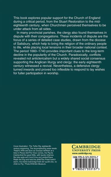 This book explores popular support for the Church of England during a critical period, from the Stuart Restoration to the mid-eighteenth century, when Churchmen perceived themselves to be under attack from all sides. In many provincial parishes, the clergy also found themselves in dispute with their congregations. These incidents of dispute are the focus of a series of detailed case studies, drawn from the diocese of Salisbury, which help to bring the religion of the ordinary people to life, while placing local tensions in their broader national context. The period 1660-1740 provides important clues to the long-term decline in the popularity of the Church. Paradoxically, conflicts revealed not anticlericalism but a widely shared social consensus supporting the Anglican liturgy and clergy: the early eighteenth century witnessed a revival. Nevertheless, a defensive clergy turned inwards and proved too inflexible to respond to lay wishes for fuller participation in worship.