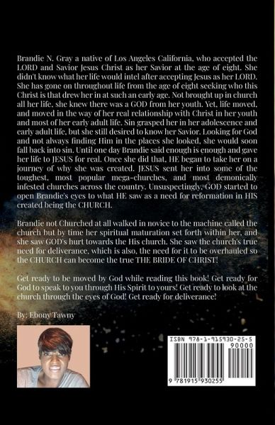 Brandie N. Gray a native of Los Angeles California, who accepted the LORD and Savior Jesus Christ as her Savior at the age of eight. She didn't know what her life would intel after accepting Jesus as her LORD. She has gone on throughout life from the age of eight seeking who this Christ is that drew her in at such an early age. Not brought up in church all her life, she knew there was a GOD from her youth. Yet, life moved, and moved in the way of her real relationship with Christ in her youth and most of her early adult life. Sin grasped her in her adolescence and early adult life, but she still desired to know her Savior. Looking for God and not always finding Him in the places she looked, she would soon fall back into sin. Until one day Brandie said enough is enough and gave her life to JESUS for real. Once she did that, HE began to take her on a journey of why she was created. JESUS sent her into some of the toughest, most popular mega-churches, and most demonically infested churches across the country. Unsuspectingly, GOD started to open Brandie's eyes to what HE saw as a need for reformation in HIS created being the CHURCH. Brandie not Churched at all walked in novice to the machine called the church but by time her spiritual maturation set forth within her, and she saw GOD's hurt towards the His church. She saw the church's true need for deliverance, which is also, the need for it to be overhauled so the CHURCH can become the true THE BRIDE OF CHRIST! Get ready to be moved by God while reading this book! Get ready for God to speak to you through His Spirit to yours! Get ready to look at the church through the eyes of God! Get ready for deliverance! By: Ebony Tawny