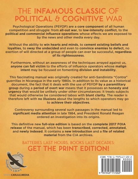 THE INFAMOUS CLASSIC OF POLITICAL & COGNITIVE WARBased on official C.I.A. declassified material. Learn the tricks and techniques of the trade and defend yourself against manipulation! All-new introduction, annotation, additional material, and index. Full-size 8.5"x11" format. Contains the full text of this remarkable manual, based on the 2017 FOIA release - not the older redacted versions. Newly-digitized text: large, clear print "Batteries last hours, books last decades: get the print edition!" Psychological Operations (PSYOP) are a core component of all human competition and struggle: from all-out war, to low-intensity conflict, to the political and commercial influence operations whose effects we are exposed to by the news and other media every day. Without the ability to win hearts and minds, to cement existing beliefs and loyalties, to sway the undecided and even to convince enemies to defect, no exertion of will directed at a group of people can ever be successful, regardless of its righteousness. Furthermore, without an awareness of the techniques arrayed against us, anyone can fall victim to the efforts of influence operators whose malign intent may be focused on fomenting division and instability. This fascinating manual was originally created for anti-Sandinista "Contra" guerrillas in Nicaragua in the early 1980s. In addition to its value as a historical document, the fact that it deals with the use of PSYOP by a paramilitary group during a period of overt war means that it possesses an honesty and urgency that would be unlikely under other circumstances: it treats subjects that would otherwise be considered taboo with blunt clarity. The reader is therefore left with no illusions about the lengths to which operators may go to achieve their objectives. Controversy surrounding several such passages in the manual led to significant media attention in late 1984, and President Ronald Reagan ordered an investigation into its origins. This definitive new full-size edition is based on the complete 2017 FOIA release of the manual, which has been transcribed, corrected, annotated, and newly indexed. It contains a new introduction and a file of related material from the CIA archives. For information purposes only. Search for "Carlile Intelligence Library" to find more fascinating, insightful publications for your professional bookshelf! Proudly published in the U.S.A. by CARLILE MEDIA.
