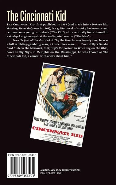 The Cincinnati Kid, first published in 1963 (and made into a feature film starring Steve McQueen in 1965), is a gritty novel of smoky back-rooms and centered on a young card-shark ("The Kid") who eventually finds himself in a stud-poker game against the undisputed master ("The Man"). From the first edition dust-jacket: "By the time he was twenty-one, he was a full rambling-gambling man, a three river man. . . . From Jolly's Omaha Card Club on the Missouri, to Spriigi's Emporium in Wheeling on the Ohio, down to Big Nig's in Memphis on the Mississippi, he was known as The Cincinnati Kid, a comer, with a way about him."