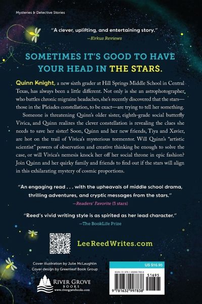 Sometimes it's good to have your head in the stars. Quinn Knight, a new sixth-grader at Hill Springs Middle School in Central Texas, has always been a little different. Not only is she an astrophotographer who battles chronic migraine headaches, she's recently discovered that the stars-the Pleiades constellation, to be exact-are trying to tell her something. Someone is threatening Quinn's older sister, eighth-grade social butterfly Vivica, and Quinn realizes the clever constellation is revealing the clues she needs to save her sister! But she can't let anyone know she's having cosmic conversations-making it in middle school is hard enough as it is-so Quinn keeps the secret message-sending stars under wraps. Soon, Quinn and her new friends, Tiya and Xavier, are hot on the trail of Vivica's mysterious tormentor. But sometimes, there are more questions than answers written in the stars. Will Quinn's "artistic scientist" powers of observation and creative thinking be enough to solve the case, or will Vivica's nemesis knock her off her social throne in epic fashion? Join Quinn and her quirky family and friends to find out if the stars will align in this exhilarating mystery of cosmic proportions.