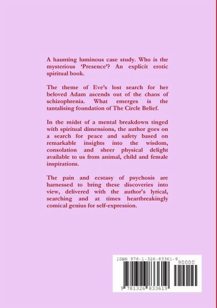 A haunting luminous case study. Who is the mysterious 'Presence'? An explicit erotic spiritual book. The theme of Eve's lost search for her beloved Adam ascends out of the chaos of schizophrenia. What emerges is the tantalising foundation of The Circle Belief. In the midst of a mental breakdown tinged with spiritual dimensions, the author goes on a search for peace and safety based on remarkable insights into the wisdom, consolation and sheer physical delight available to us from animal, child and female inspirations. The pain and ecstasy of psychosis are harnessed to bring these discoveries into view, delivered with the author's lyrical, searching and at times heartbreakingly comical genius for self-expression. About the Author The inspiration for The Circle Belief began after the author suffered a mental breakdown and was homeless in Edinburgh.