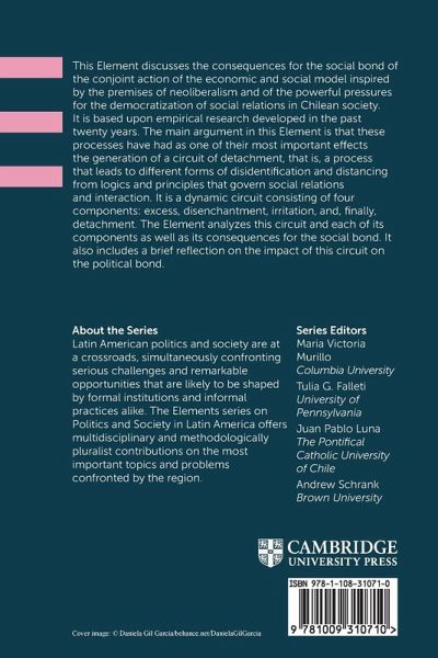 This Element discusses the consequences on the social bond of the conjoint action of the neoliberal economic and social model and of the powerful pressures for the democratization of social relations in Chilean society. It analyzes the circuit of detachment, its components, and their consequences for the social and the political bond.