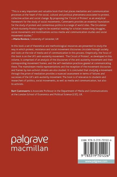 In this book a set of theoretical and methodological resources are presented to study the way in which protest, resistance and social movement discourses circulate through society and looks at the role of media and of communication in this process. Empirically, the focus of this book is on the UK's anti-austerity movement. 'The Circuit of Protest', as developed in this volume, is comprised of an analysis of the discourses of the anti-austerity movement and their corresponding movement frames, and the self-mediation practices geared at communicating these. The mainstream media representations and the reception of the movement discourses and frames by non-activist citizens are also studied. It is concluded that studying a movement through the prism of mediation provides a nuanced assessment in terms of failures and successes of the UK's anti-austerity movement. The book is of relevance to students and researchers of politics, social movements, as well as media and communication, but alsoto activists.